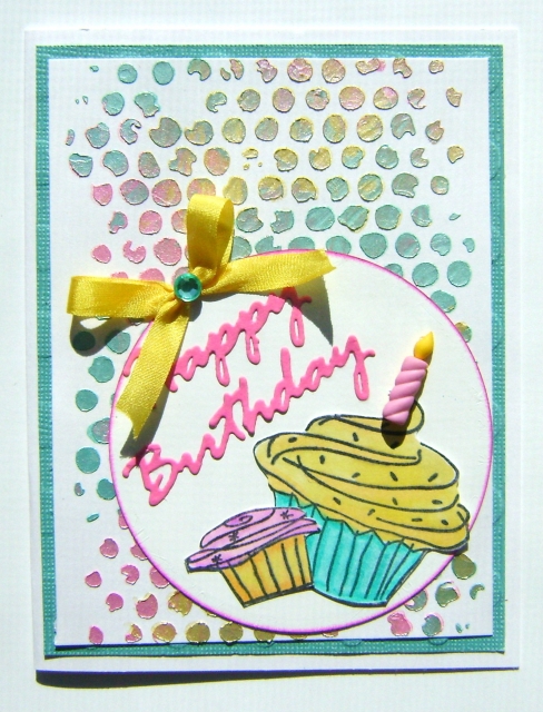 Here is my mixed media card. I use 3 colors of Nuvo Mousse on a dot stencils. This mousse is shimmery. I used colored pencils and Gamsol to color my images. The cupcakes were fussy cut and added to the circle along with the Happy Birthday die. A rhinestone was added to the bow.