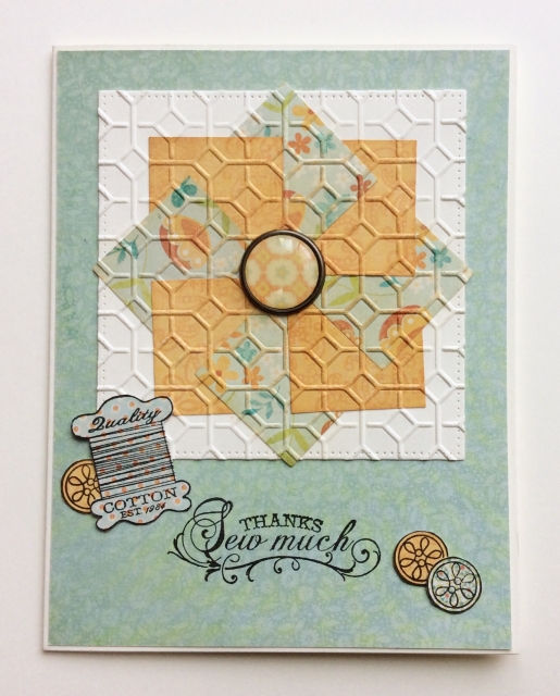 The stamps are from Sew Pretty, which was a freebie from Cardmaking and Papercraft Magaine. The paper is My Mind's Eye , Stella and Rose Tangerine, Embossing Folder Cuttlebug Decorative Tiles.