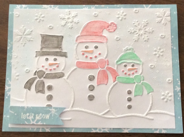 Used a embossing folder,colored raised parts with Inktense pencils. Used a Versifine pen on snowflakes and snow lines and embossed with sparkle white, stamped more tiny snowflakes and bossed for more sparkle. Stamped words and embossed.