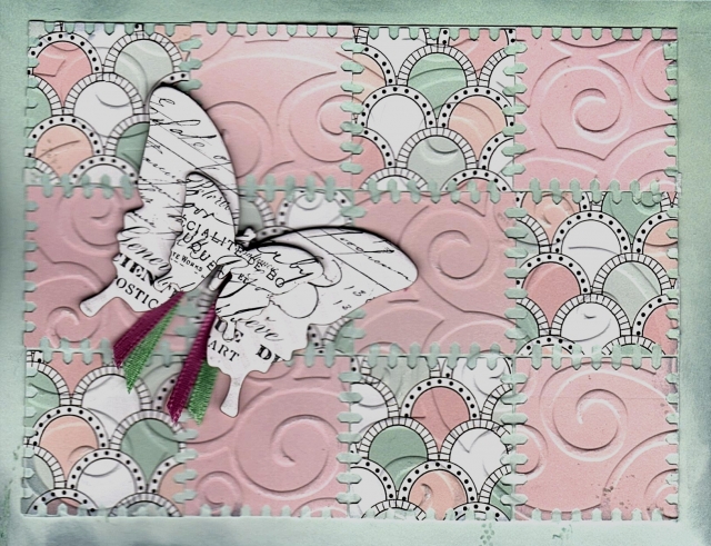 This is my sample card for my Challenge (WF17 Quilted Square). Had a pad of paper that allowed me to use two sheets of paper and use my die cutter to cut the 12 squares and the alternate them. Then front of card was run thru Cuttlebug with embossing folder. Added the two butterflies and the ribbon. Also used T Holtz weathered wood Distress Ink on the edges. I will be using this card as a birthday card for a friend that quilts.