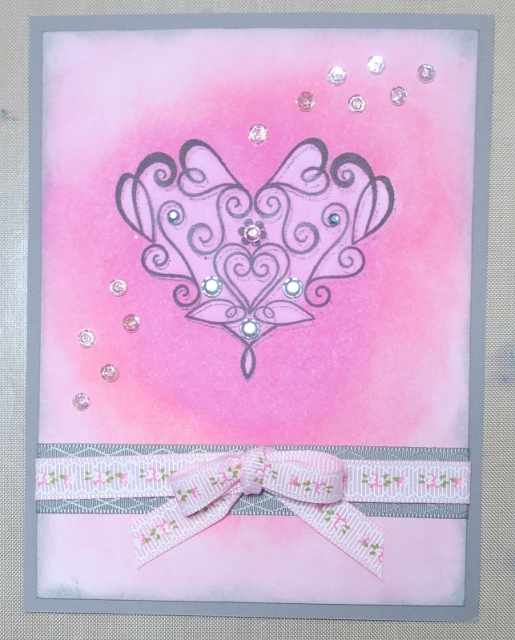I used DI in Spun Sugar, Picked Raspberry and Worn Lipstick. I then inked the edges with Hickory Smoke. The heart is a My Favorite Things Stamp. I stamped it with Versafine Onyx Black. I attached the sequins with stickles. I added some gems to the heart. The ribbon is from Really Reasonable Ribbon and I used my bow-it-all to make the bow.
