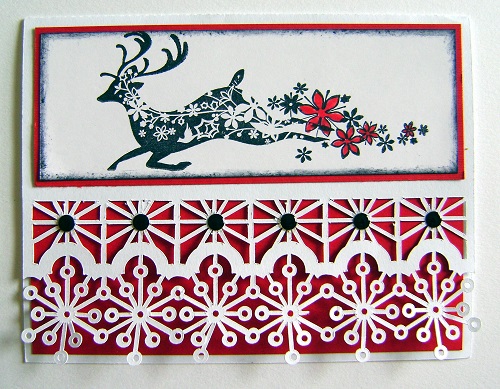 Here is another Christmas card that I made using my eclips 2 machine. The reindeer is from Inkadinkado. I colored some of the poinsettias behind the deer using Spectrum Noir markers. I sponged black ink around the white piece at the top.