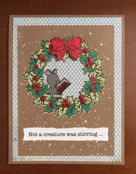 The wreath was stamped on light green cs, colored with pencils and die cut. The bow was stamped on red glimmer paper and die cut. The mouse was stamped on kraft, colored with pencils and fussy cut. I also stamped him on the background paper but you can barely see his curly tail. The sentiment was printed from my computer and die cut. The bow is adhered with foam adhesive.