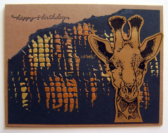 I had never used Liquid Pearls using a stencil and I love how it turns out! I used Tim Holtz's Burlap stencil on black card stock and used copper and gold Liquid Pearls. I stamped the giraffe (unknown) on heavy dark gold vellum, heat embossed him and fussy cut him to add to the card.