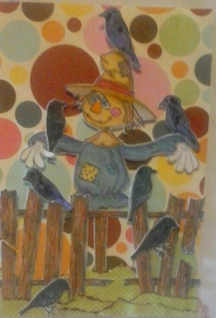 A different approach to my bingo twist card. I drew a new scarecrow & fence then colored & fc'd them. I mirror-stamped the crow (3 times) & regular-stamped 4 times. Fc'd them.The green PP is torn paper edged with plum ink.