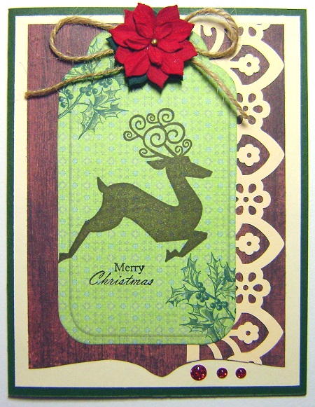 I used wooden patterned paper. Added a border from my stash. Stamped the cuttlebug deer on the tag and added embellishments.