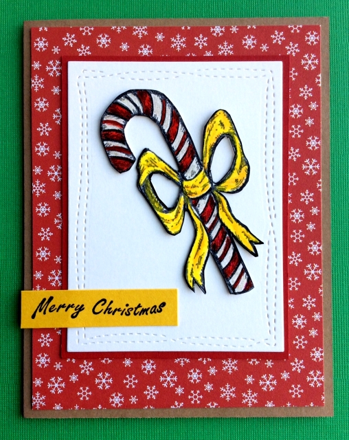 I was inspired when I saw Connie’s candy cane card, so I found this image of a candy cane from Our Daily Bread Designs that I had already stamped out on bristol paper. I colored it with pencils and a glitter pen (I couldn’t remember what ink I used to stamp with) and cut it out. I dug around and found some scraps of cardstock and a piece of patterned paper that worked with it.