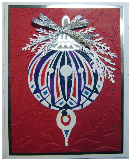 I also found this ornamant in my stash that I stamped on heavy vellum and used white ep on it. It was colored with Spectrum Noir glitter pens. I fussy cut it and added it to an embossed background that I found in my stash. I added punched "greenery" and a siiver bow. The stamp is by Aline Stamping.