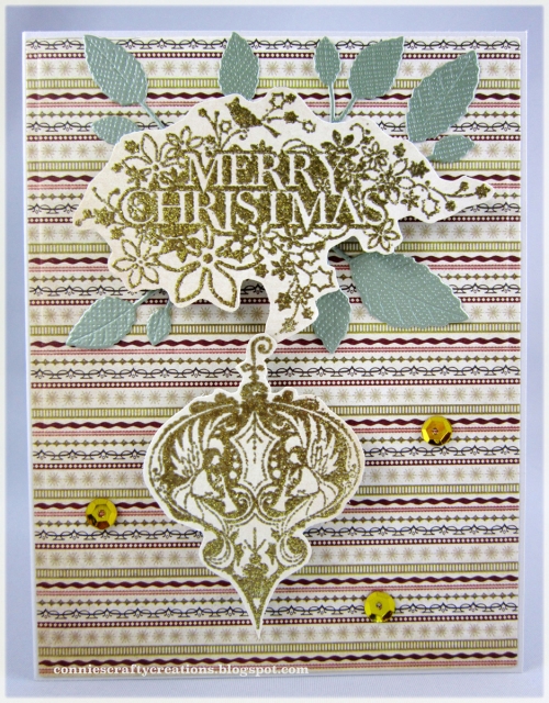 The pattern on the ornament shows up really pretty on the light paper. I like the patterned paper background too. It adds to the vintage, shabby chic (?) vibe.
