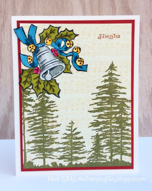 Supplies: Just for Fun Rubber Stamps Bells and Holly stamp, Glorious Song Background stamp, Silhouette Pines stamp.