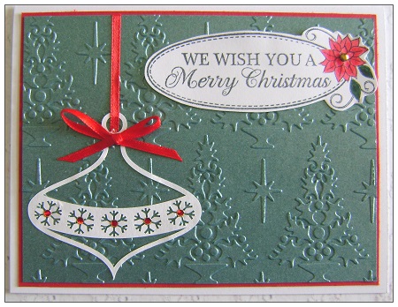 Very nice. The green is very pretty and I love the embossing folder. Love the ornament too.