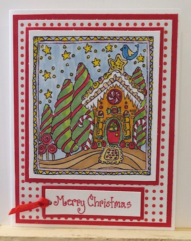 A second Christmas card for this year. Colored stamped image (Color Me - Angela Porter) with Copics. Stamped quote, and adhered to card front, attaching ribbon. Adhered panels to patterned paper, then the white card base. TFL