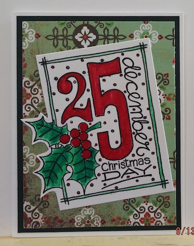 Borrowed this stamp image (Woodware - Christmas Date #JGS169) from Daria. Colored with Copics, cut out, and adhered to patterned paper. Matted to green CS, then to white card base. TFL