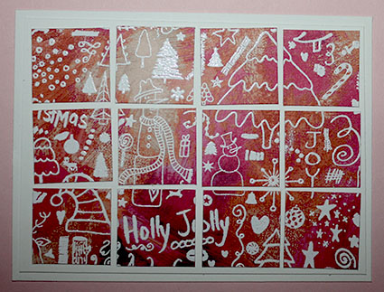Using white embossing powder, heat emboss your background using the stamp above called Christmas Whimsy Background.