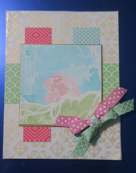 I made this card for Christmas 2016. I stamped the image with Versamark and embossed with clear embossing powder. Then I inked it with Distress Inks. I cropped the image.