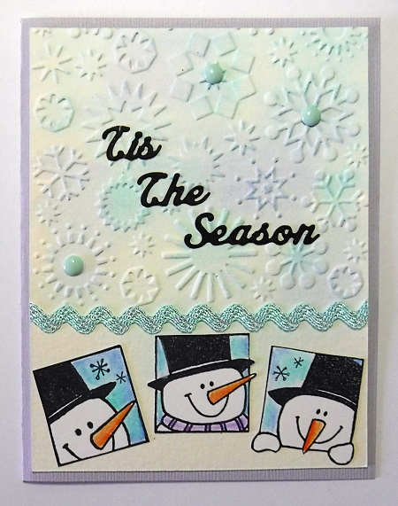 I used a cuttlebug snowflake embossing folder with watercolor paper. I did a very light colorwash over the snowflakes using Distress inks. I used the snowmen from my image stash. I don't know the company. The saying die is from Die Versions. I colored the stamps using colored pencils and Gamsol.