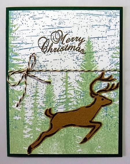 I found this background in my stash. The trees and blue slashes are both background stamps. I stamped the blue slashes over the trees. The reindeer from Just For Fun was stamped on kraft cs, fussy cut and added to the card. The saying is from Sparkle N Sprinkle.