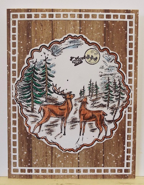 Stamped Image, and colored with Prismacolor Pencils. Adhered to patterned Paper, framed with Penny Black Square Frame - Creative Dies. Image: Creative Expressions - Moonlight Deer. I made 5 of this image, some with different backgrounds. TFL.