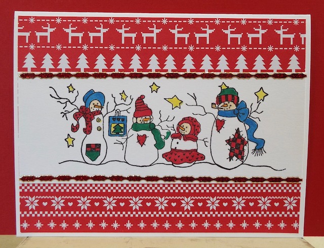 Found this old image from long ago, and decided to play with it. Image: Alma Lynne (Inkadinkado). Colored with Copics, and adhered to patterned paper. Embellished with red stickers. I made two of this image, using different patterned paper for the other card. TFL