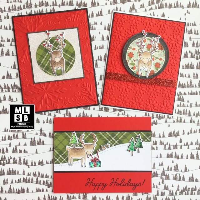 Oh my gosh these are cute! I love the plaid sky! The embossing really jazzes up the top two. That front facing reindeer looks great coming out of the circle.