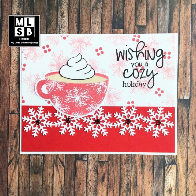 I really like the background paper you made with 2nd generation stamping and the dots! Cozy card! Is that eggnog in that cup? Yum!