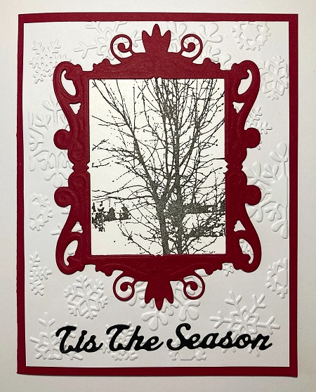 The embossing folder is by Cuttlebug. The scene is unknown. I have had this stamped image in my stash forever! The Victorian frame is by Memoery Box. The word dies are unknown.