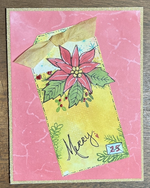 The poinsettia is mounted with thin foam mounting squares. Maybe I should have foam mounted the whole tag, but it will be easier to mail this way. I was worried about a dimensional ribbon knot on a raised tag mailing nicely.
