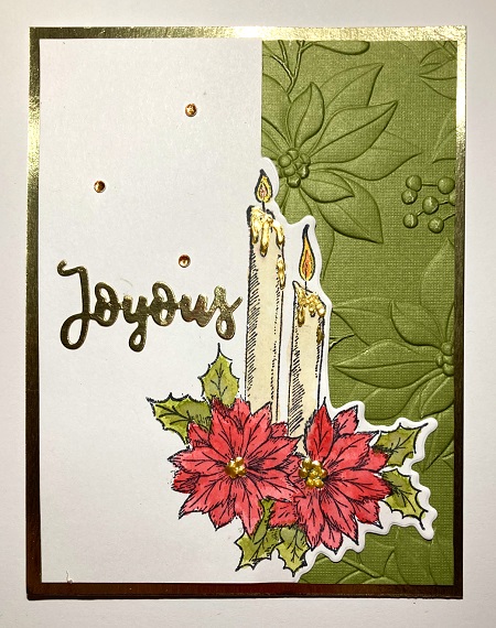 I watercolored using Distress inks. I used an image and die set by Gemini called Christmas Candles. The saying was cut out using a Sizzix die. The embossing folder is by Spellbinders. I added Liquid pearls for the drips on the candles and for the poinsettias' centers.