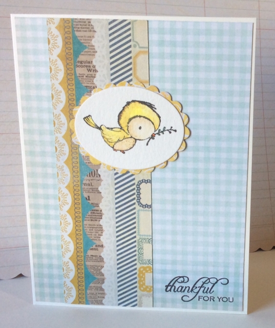 I used a mix of My Mind's Eye patterned papers here ( a lot of them go together so well) and an image from Purple Onion Stacey Yacula that I colored with watercolor pencils. I have had pieces parts for these cards ready for over a month and I now have them ready to send out as a gift set. I am giving them to an older relative who I think will enjoy them.