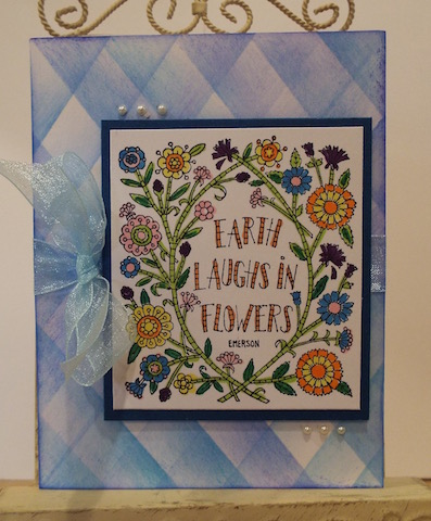 Stamped image, and colored with copics. Found the image to be very small and detailed to color. Matted, and adhered to background piece I previously made some time ago. Embellished with blue ribbon and pearls. Stamp: Pink Ink Stamp Co. TFL
