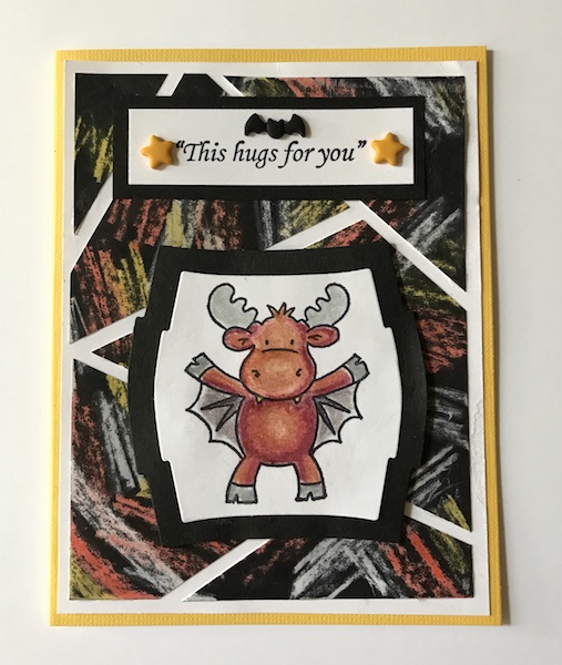 I needed another Halloween card so I made a scribble scrabble background in candy corn colors. I cut my scribbled background up and glued it on white cs, then on a yellow card base. (afterwards I'd wished I hadn't, as it was a pain in the butt to try to line up the pieces just right!)