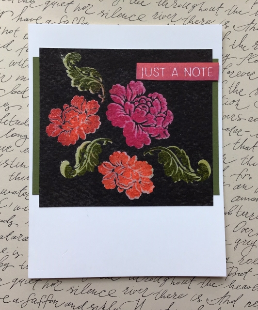 So this is the result of trying to do this Jennifer McGuire’s Method. I did change it up just a bit by stamping the images out onto watercolor paper, and then spritzing with water to get a watercolor look. I’m going to try to put the photo of what this looked like in the forum post. It would have been a better choice to use Distress inks for the stamping, but I used regular dye inks, so they didn’t flow as much.