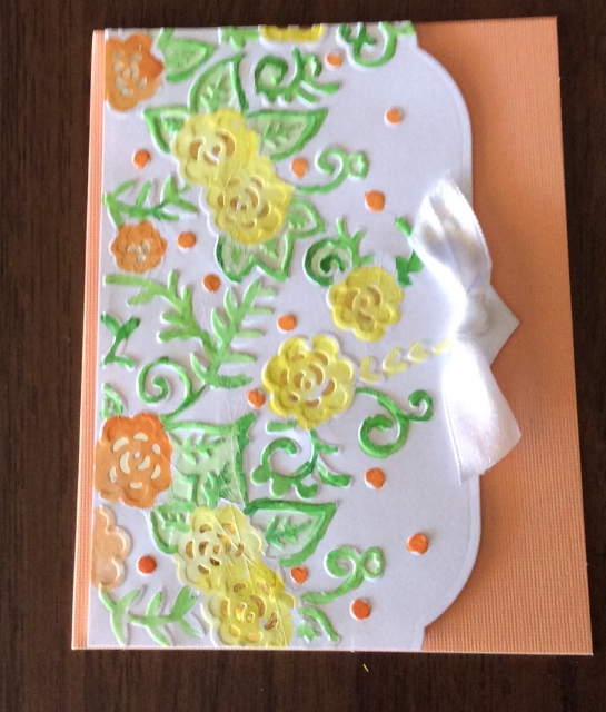Your embossed and cut piece looks great with the die cut edge and the ribbon. Great ideas!