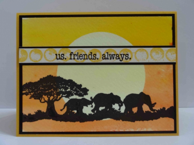 Cut and apply a circle sun mask to the watercolor paper. In order below brush on colors below with a waterbrush using little waterto avoid diluting the paint. Use colors as listed below. Apply slightly overlapping horizonal strokes. Dry. Add sentiment. Emboss elephant stamp in black EP.
