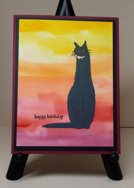 This was a last-minute card for my son’s birthday. I used a background I had made a long time ago and a stamp I have never used before. I didn’t really think I’d ever use the background because it is so bright with irregular coverage. However, I was happy with the way it looked with this silhouette cat.