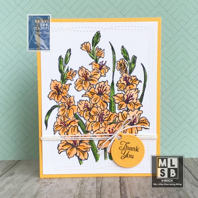 Supplies: I Brake for Stamps August Gladiolus, Sentiment from Florals Sheet, Avery Elle Wonky Stitched Rectangles, American Crafts Twine, Spectrum Noir alcohol markers.