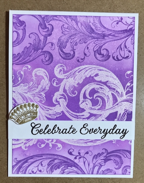 Sentiment is stamped in Versafine Onyx black and clear heat embossed. The crown was heat embossed with gold embossing powder and fussy cut. The crown is adhered with foam tape.