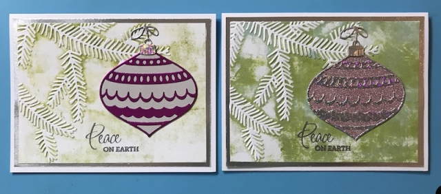 I finally finished my 12 card fronts in to full fledged cards. I had two extra backgrounds that weren't my favorites but decided they will be fine with big shiny ornaments on them.