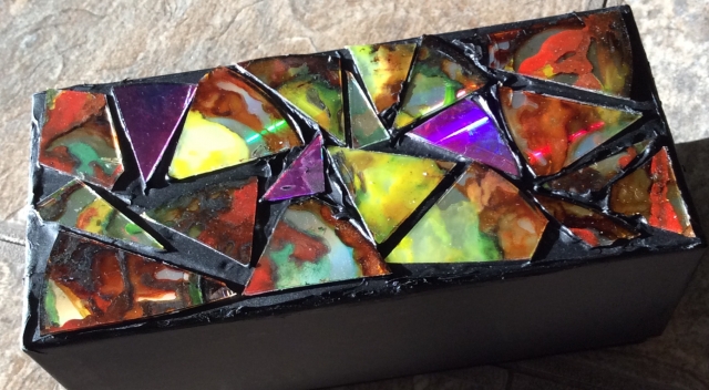 Project I did . Alcohol ink A cd, cut up and grouted With paste on small black box.