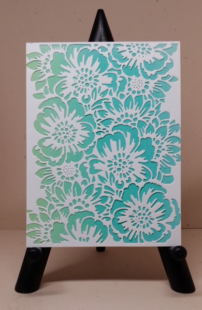 Nora sent me three of these die-cuts. Thank you, Nora. I’ve had them for a while, and they sure have come in handy now that I needed some new cards in a hurry. I held them over a bunch of my previously made backgrounds and thought they looked best with the three I chose—two water colored backgrounds and one ink-blended background. The easiest three cards I’ve ever made!