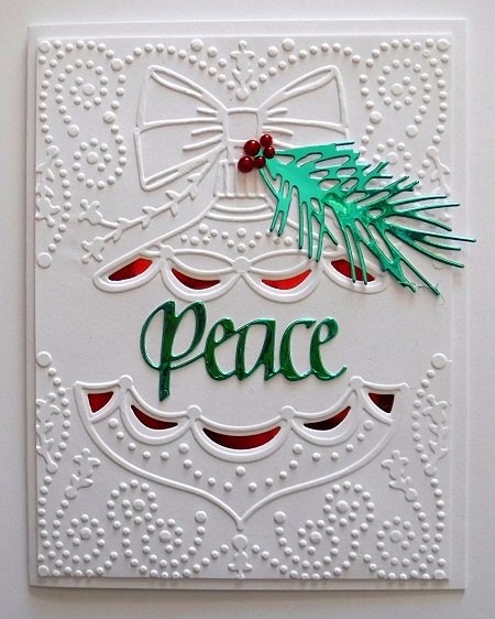 I have not used this embossiing folder before. It is by Spellbinders. I placed red metallic card stock behind the ornamnet. Peace die by Elizabeth Craft. Greenery by Impression Obsession - both cut from green metallic card stock.