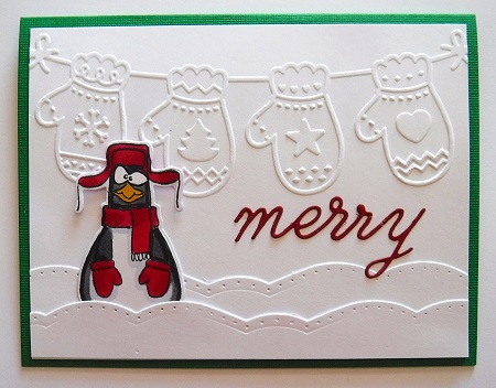 This little penguin cracks me up! He is s new stamp I bought right before Christmas. Image is from Rubbernecker. The mittens embossing folder is by Darice and I have not used this one before! I had so many embossing folders I never used! Glad to use them now. Merry die is from Poppey Stamps and the "snowbanks" are from the Card Maker set by Spellbinders.