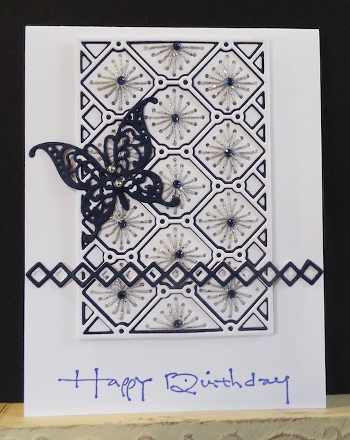 A second card using the Spellbinders Die of the Month for December 2021. Used a silver/gray thread for this one, and embellished with gems and Cottage Cuts Butterfly. Stamped Happy Birthday ( Print Works).