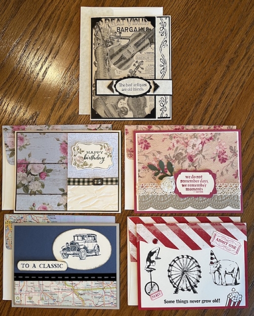 I went to a Stampin Up stamp camp last week. Here are the cards we made (not all SU products). The theme this month was "very vintage". We used map paper and catalog paper.