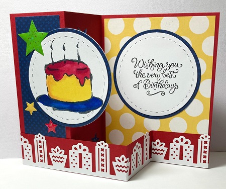 I have not made one of these cards in a long time! Thanks for the challenge. The gifts at the bottom were made using a Martha Stewart punch. The cake image if from Just For Fun. The saying is by Hero Arts. The stars are stickers.
