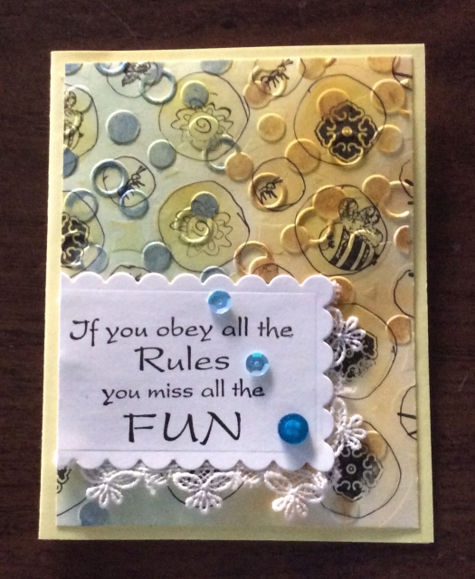 I took background where I stenciled wonky circles and stamped bugs and flowers in the circles. Then ink blended over top. Then used another new embossing folder that had circles. Then watercolored the raised circles with metallic Watercolor