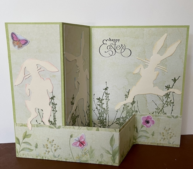 Ink : Archival Olive Green, Versafine Onyx Black. Sponged the edges of the bunnies with soft pastel colors, a light pink, a light blue and antique linen.