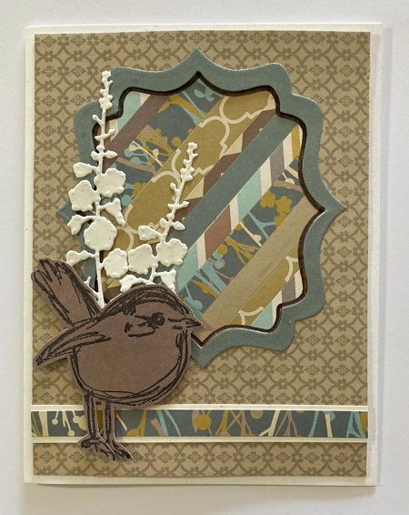 I took an almost used up 6x6 paper pad and made this card. I used strips of the paper in the frame as a focal point. I stamped the Scribbly Bird by Dina Walkley onto some of the paper and fussy cut it. I added some dies from the Wildflowers #2 die set by Tim Holtz.