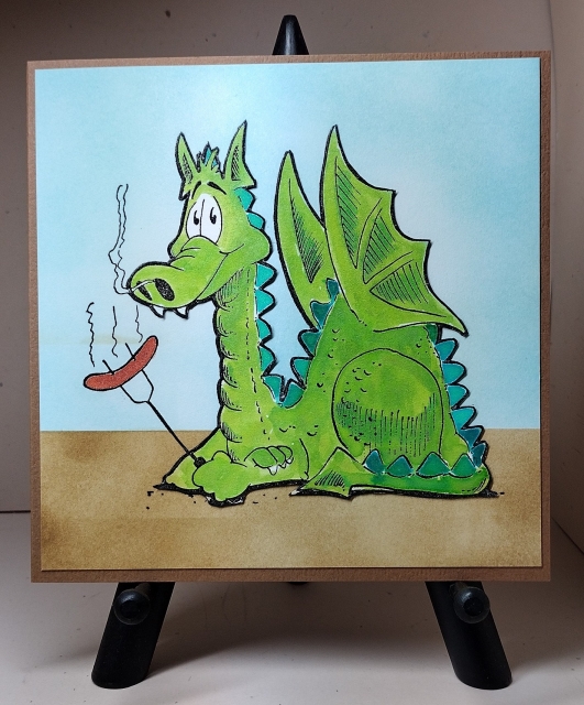 I made a couple of cards with this image many years ago. I gave them to a teenager and a young adult. For my nephew who is celebrating his second birthday, I chose brighter colors. I do love this image. On the inside, there is a Judikins stamp that shows a cake that is melting down with the candles still lit. The message is about having missed a birthday. I masked the missed-birthday sentiment and inked up the cake and the words “Uh-oh.” My written message said not to let the dragon light the candles on his cake!