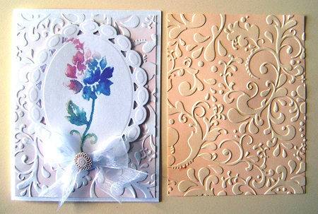Loved the bisque technique and smoosh stamping. I combined the 2 on this card. I used versacolor seashell ink on both backgrounds. On cream cs it looks peachier and on white cs it looks pinker. The versacolor ink worked great. I also tried chalk ink and it was a little streaky.